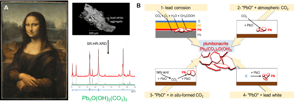 This research was notably conducted via the analysis of lead-based paint formulations by Rembrandt (1606–1669) and Leonardo da Vinci (1452-1519). The composition and microstructure of these formulations were studied through a combination of structural (synchrotron-based XRPD) and molecular (µFTIR) probes. This enabled the charting at the micro-scale of neo-formed metastables compounds, fingerprints of the historical recipes used by the painters. Hypotheses on the chemical reactions at stake were then proposed.