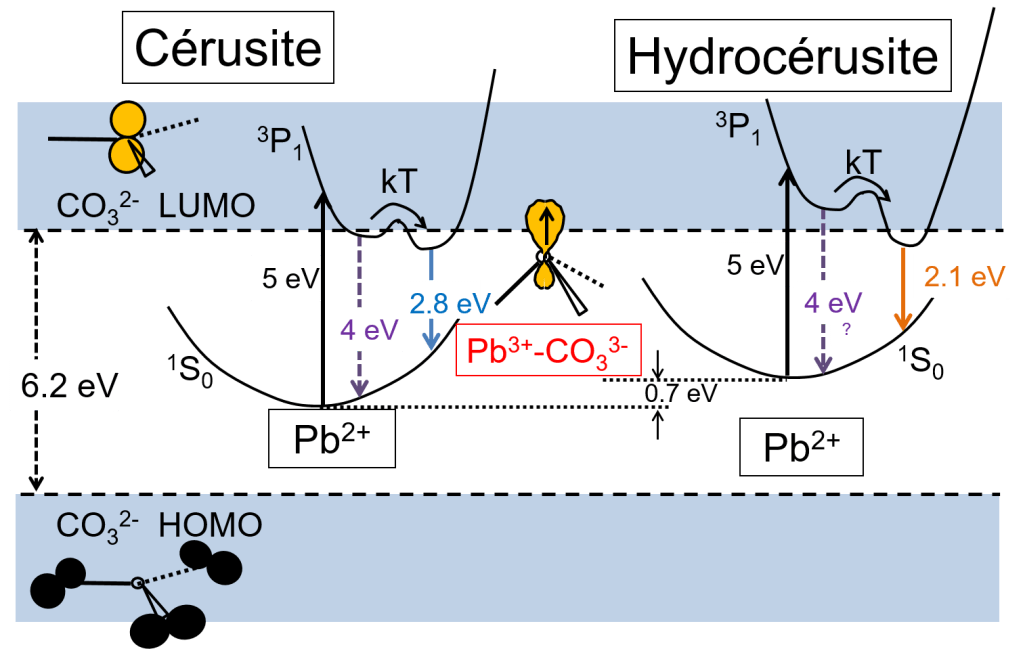 We also studied the photoluminescence (PL) properties of the constitutive phases of lead white in order to identify potential signatures of their synthesis and their use in paintings. We assigned the PL bands in the visible range to charge transfer transitions of the type Pb3+-CO33− → Pb2+(1S0)-CO32− + hν and showed that at high excitation energy (5 eV, 250 nm), the excitation of the carbonate matrix induces different PL emission bands for the two constituent phases of the pigment (cerussite at 2.8 eV and hydrocerussite at 2.1 eV). We therefore proposed the use of PL spectroscopy to discriminate between these crystalline compounds in paints.
